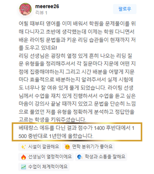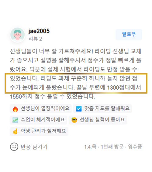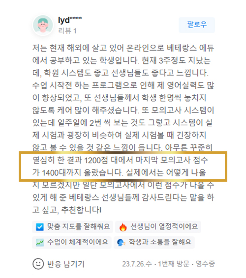 온라인 수업으로 3주 만에 1200점 대에서 1400대까지 올랐습니다.